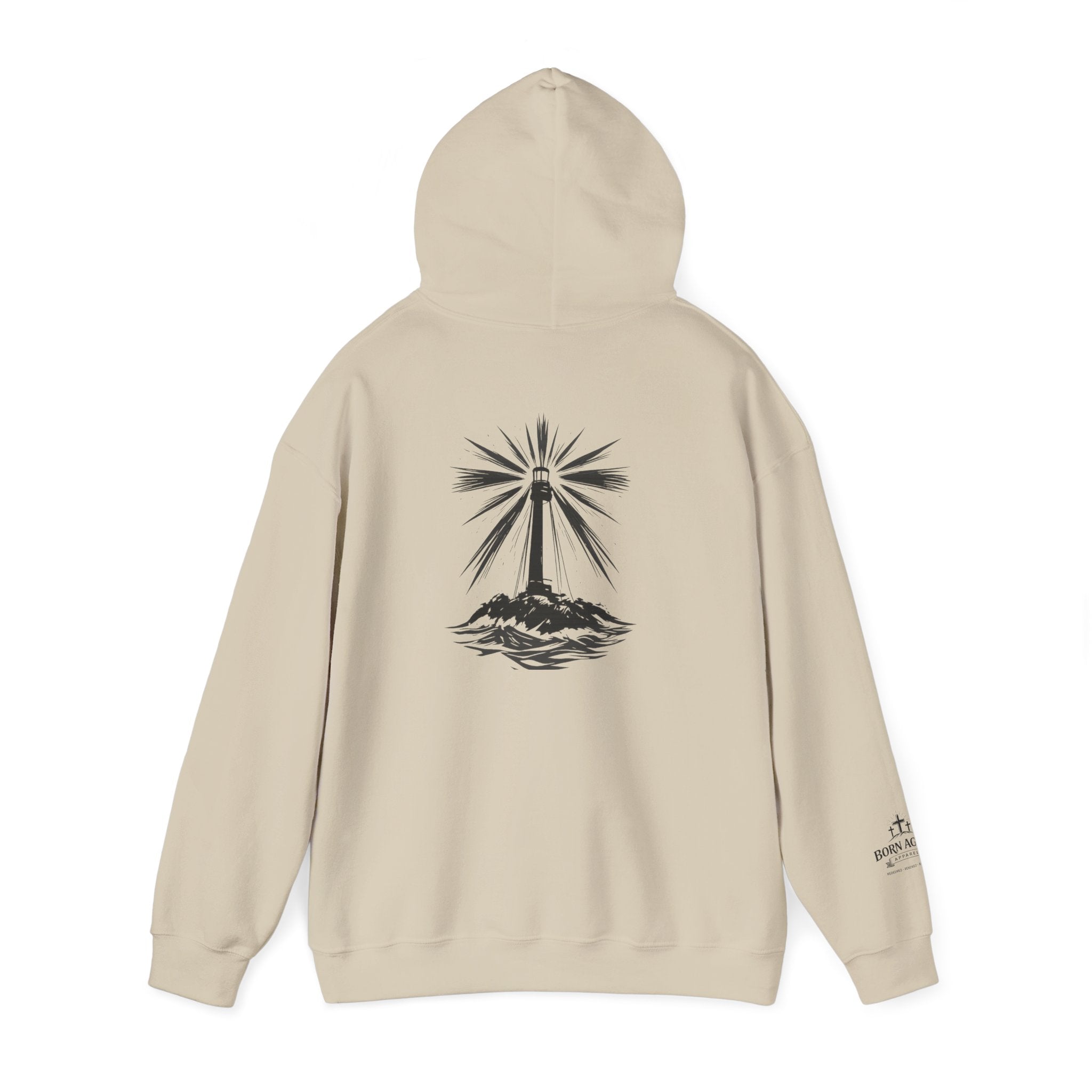 Be the Light Hoodie — Inspirational White Graphic Hoodie with Lighthouse Back Design